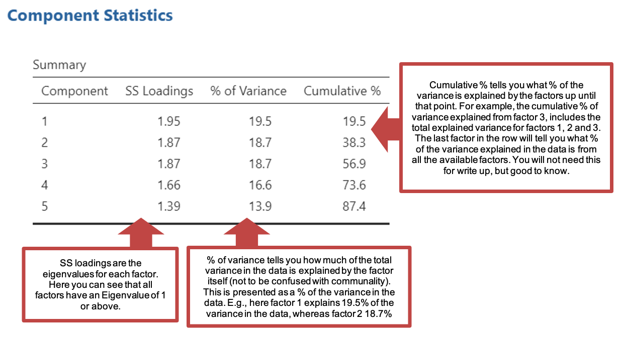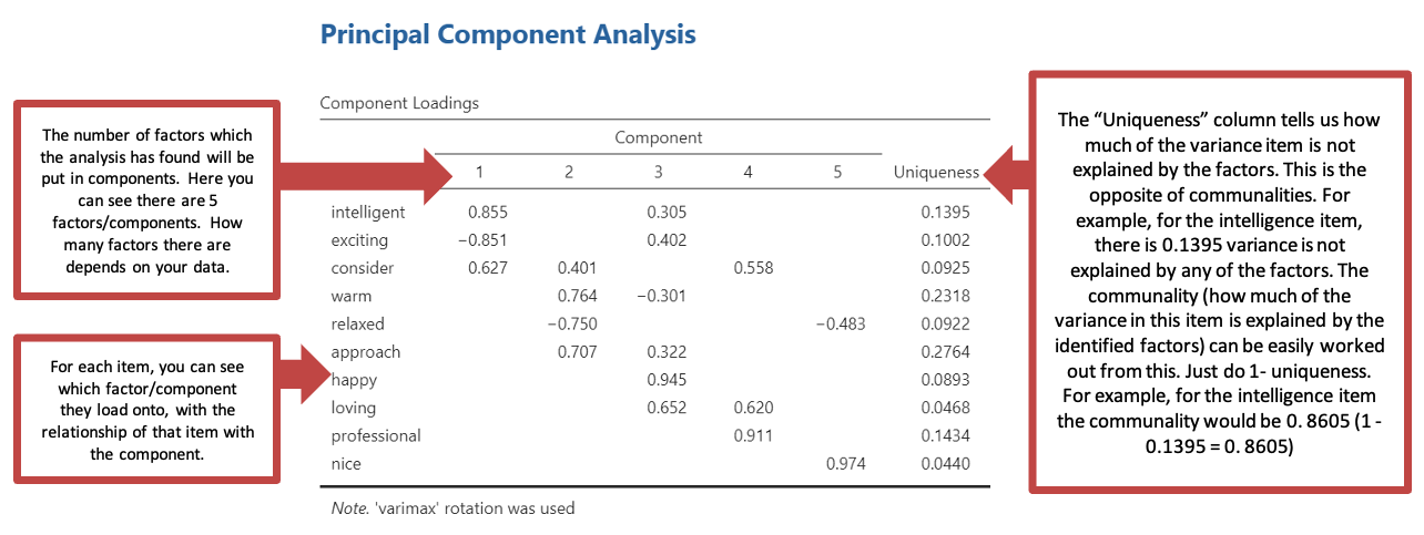 - Under “Component Loadings” you will be able to see how many factors (also known as components) have been identified in your data through the analysis. While there is 5 in the below analysis, this depends on your data, and may not be the same. You can also see for each individual item, how they load onto each factor (only when it is higher than the minimum factor loading you selected, in this case 0.3) and how much of the variance in each item is unexplained by any of the factors (which will help you work out the communalities). This analysis gives you post rotated data.