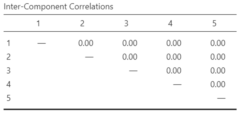 - You can view the “Inter-Component Correlations” matrix, which tells us how much each of the factors created are correlated with each other. You can see below that the factors within this data are not correlated with one another. Your data will likely be different.