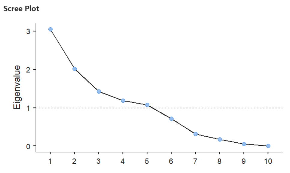 - You will also be able to see the screen plot below, which tells you how many of the factors have an Eigenvalue of 1 or above. You can see here; 5 factors had an Eigenvalue of 1 or above. Those 5 factors were provided to you in the tables described above. However, there were a further 5 factors which had an eigenvalue below 1 which were not provided in the analysis. Remember that your analysis will be different because you have different data!