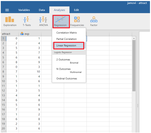 In Jamovi, once you have checked that the data are suitable for linear regression, go to Analyses > Regression > Linear Regression