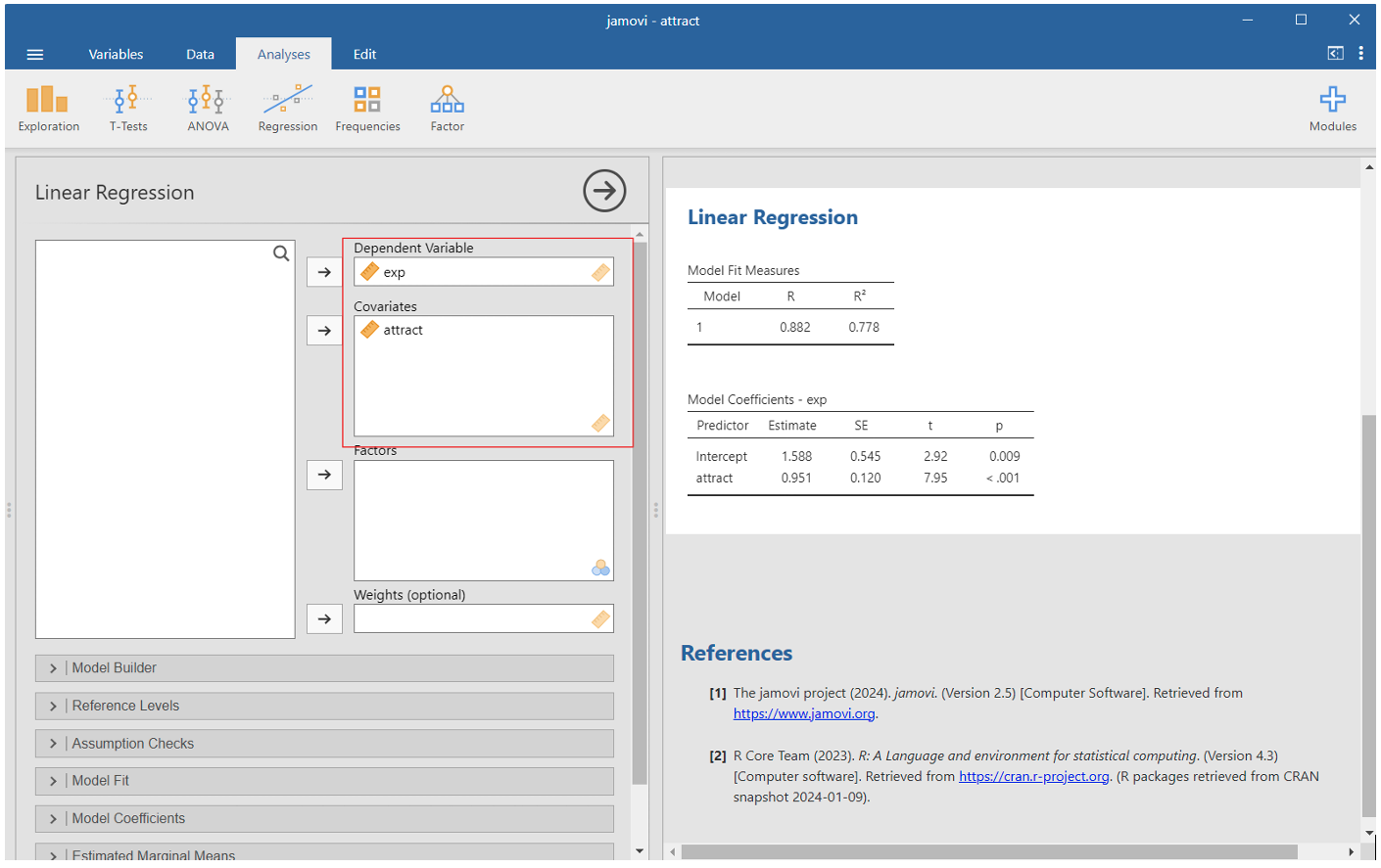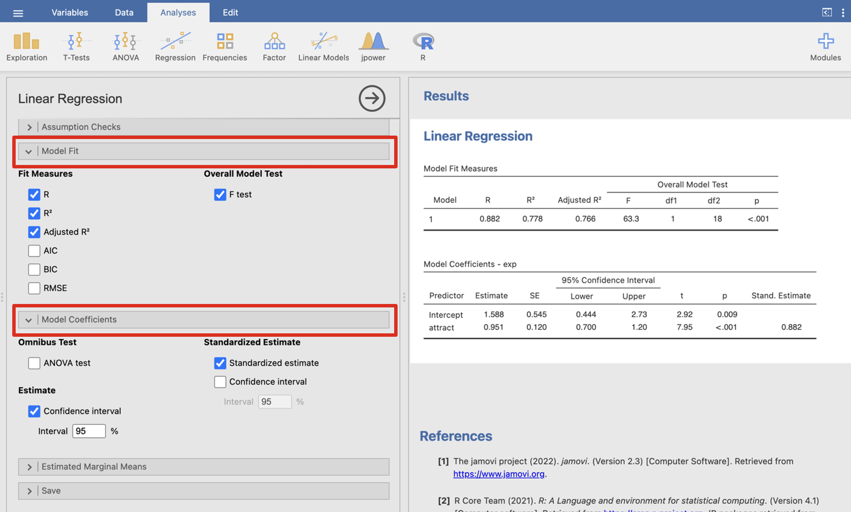 - Use Jamovi to conduct a linear regression, interpret the output and write up the findings in APA format.