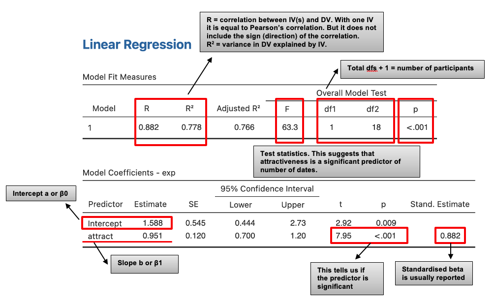 “A linear regression was used to examine the relationship between attractiveness and the number of dates someone had been on. The regression equation produced a good fit with the data (R2 = .778), indicating that, as hypothesised, someone’s attractiveness score was a good predictor of the number of dates they had been on, F(1, 18) = 63.252, p < .001.