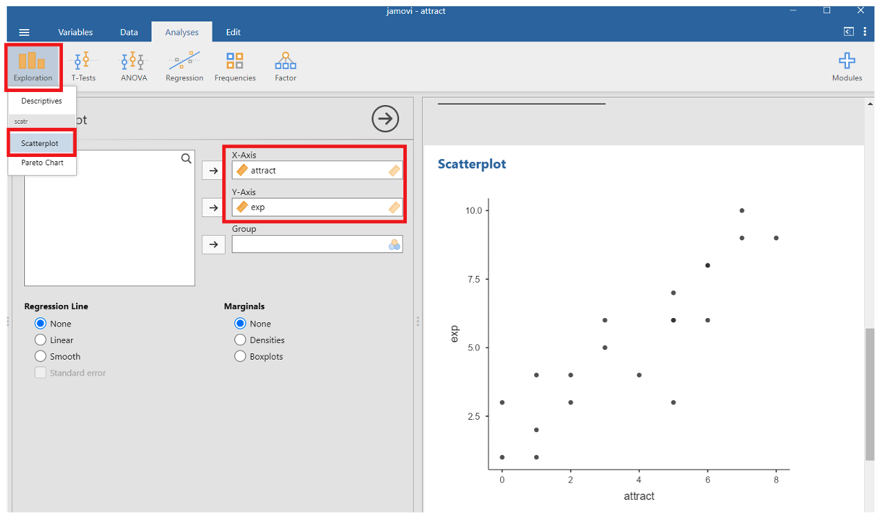 Using the attract.csv data, create a scatter plot. In Jamovi click on Exploration > Scatterplot.