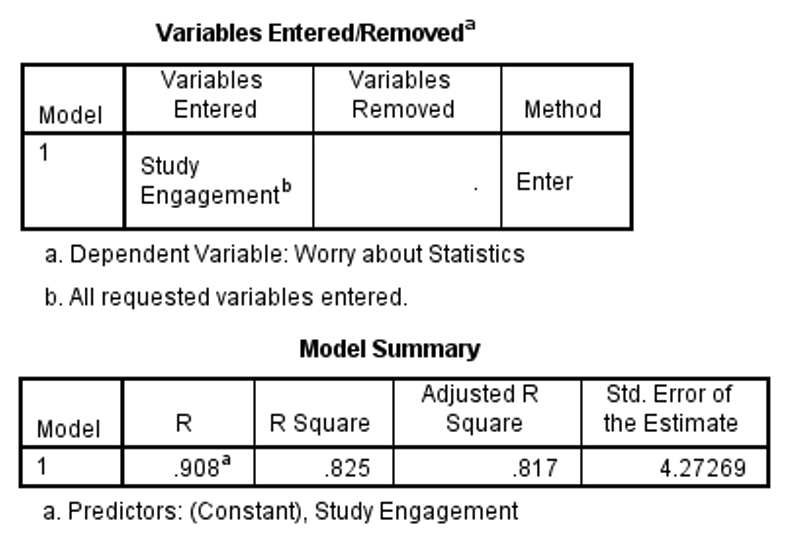 Based on this output, we can tell that 82% of the variance in worries about statistics could be explained by hours of study engagement (e.g. see the adjusted r square value in the model summary box). We can also see that hours of study engagement was a significant predictor of worries about statistics. Note that older versions of SPSS report p < 0.001 as .000. Make sure this doesn’t through off your interpretation, it still means p < .001!