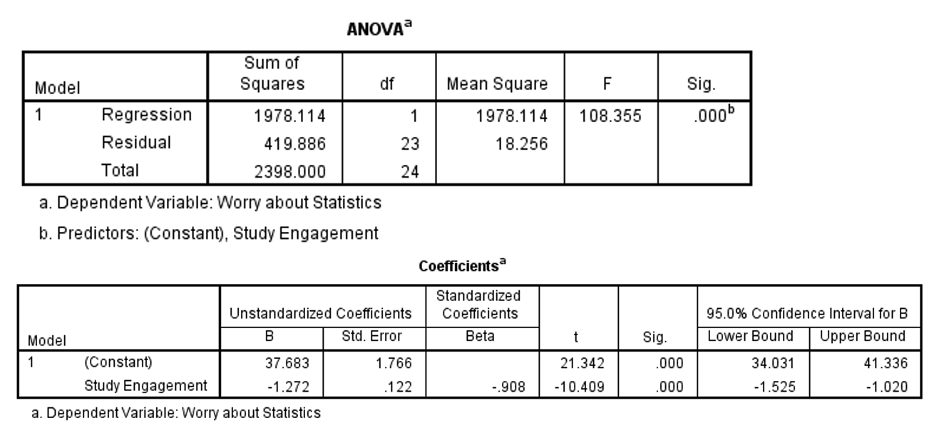 Occasionally, you might need to interpret statistical outputs which have been generated using different statistical software, such as SPSS. Below you will see an example SPSS output which investigated if the researchers could predict levels of worry about statistics using hours of study engagement (e.g. hypothesising that as hours of study engagement increased, worries about statistics would decrease). Look at the output below to see what you can interpret based on what you know about linear regression so far.