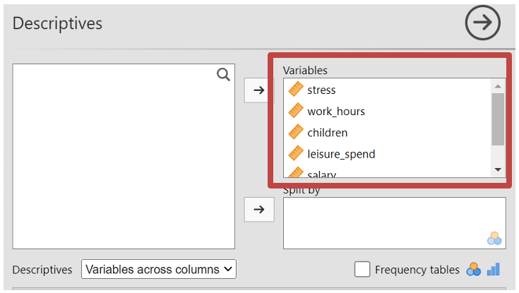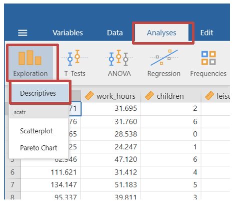 Look at the descriptive data by going to Analyses -> Exploration -> Descriptives