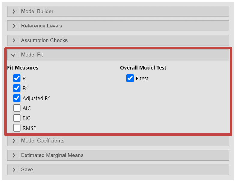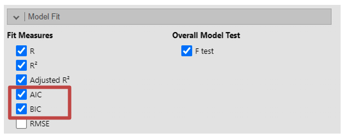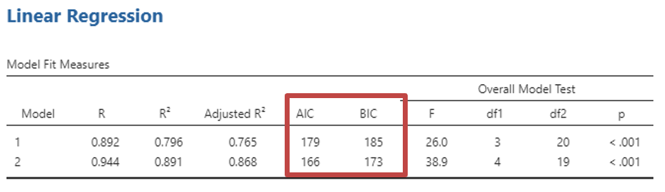 Ideally a good model for a data set includes only significant predictors. We could carry out the search for a good model ‘manually’. I.e. seeing differences in results when we remove or add a predictor, as Jamovi is dynamic you can see the differences, or so that you can compare each variable, you can add each variable to a different model. You can then see how well the different models predict variance in the dependant variables. To do this select “AIC” and/or “BIC”.