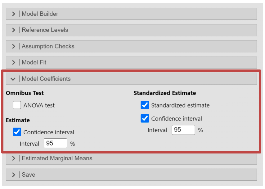 - Estimate - Confidence interval: this will provide the confidence interval of each coefficient