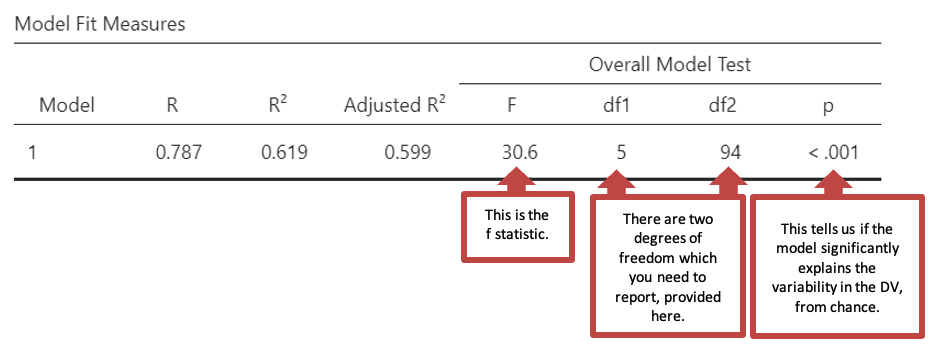- The first table “Model Fit Measures” gives you information about the goodness of the models fit for your data. R2 is a measure of the variance in the data that the model can explain in the sample tested. The regression was statistically significant: F(5, 94) = 30.6, p < .001