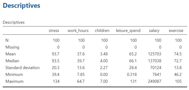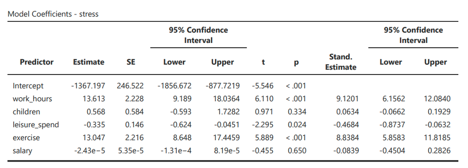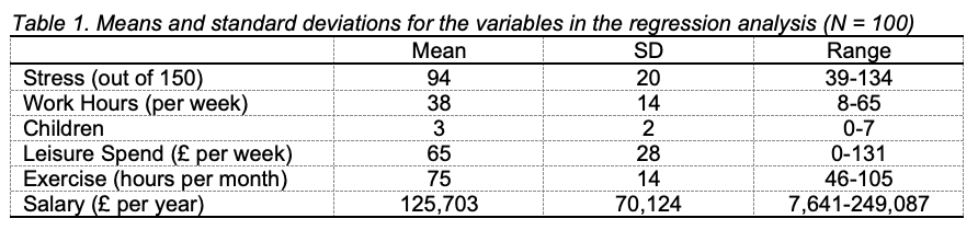 “A regression analysis was conducted to examine which variables predicted stress. The variables were entered simultaneously. Work hours, exercise and leisure spend were significant predictors of stress. All variables together accounted for 62% of the variance in stress in the sample. People who reported higher stress levels also report longer work hours (β = 9.12, p < .001), tended to exercise less (β = 8.84, p < .001) and spent less money on leisure activities (β = - 0.47, p = .024). Neither the number of children (β = 0.06, p = .334), nor salary (β = - 0.08, p = .650) were significant predictors of stress.”