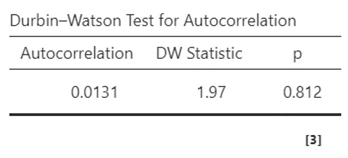- You will also be allowed to check some assumptions, which you can review in “Assumption Checks”. The first is the Durbin-Watson Test for Autocorrelation, which tests for the assumption of autocorrelation. This is when the residuals are not independent of each other, meaning that there is some pattern or correlation between the residuals at different points in the data. If the Durbin-Watson test statistic is close to 2 (typically between 1.5 and 2.5) this indicates there is no serious autocorrelation. Anything above or below suggests a negative or positive correlation between residuals. Here you can see the DW Statistic is 1.97, which means we can continue with the test.
