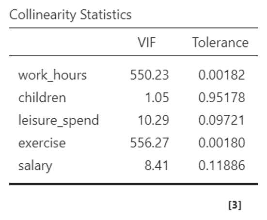 - Continuing under the “Assumption Checks” section, you can see the “Collinearity Statistics” table, testing the assumption of multicollinearity. This is the extent to which independent variables are correlated with one another. Jamovi uses the VIF statistic (if you have selected this). VIF values above 10 or tolerance values below 0.1 indicate potentially problematic collinearity.
