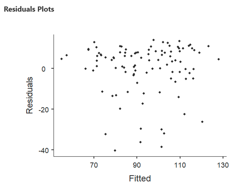 - The first residual plot where the X axis is labelled “Fitted”, relates to the error/residuals in the regression. It is not a scatterplot of the relationship between the DV and the predictors, those are provided as you scroll down. To test the assumption of homoscedasticity and linearity, you can look to see if there is a random scatter of points as the fitted values increase. This indicates that the relationship between the predictors and the response variable is adequately linear, and that the variance of the residuals are constant (homoscedasticity).