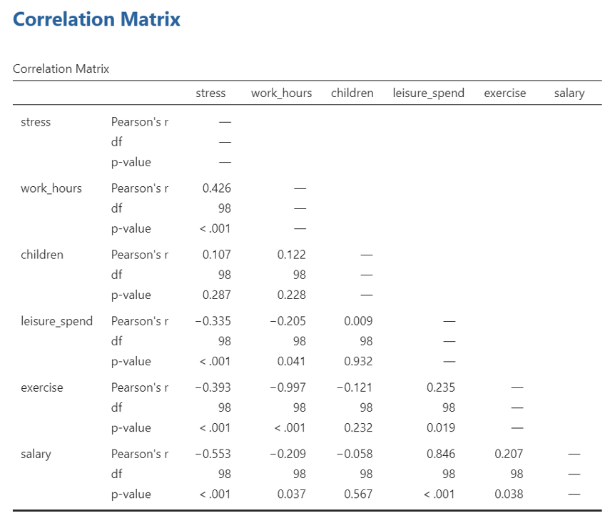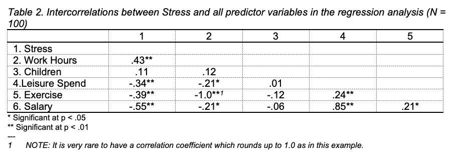 “The correlations between stress and the predictors work hours, children, leisure spend, exercise and salary (see Table 2) showed that stress was positively and moderately correlated with hours worked, negatively and moderately correlated with salary, and negatively and weakly correlated with leisure spend and exercise. Stress was not correlated with the number of children. In fact, none of the five predictors was correlated with the number of children. Work hours were negatively and weakly correlated with leisure spend and salary, and were negatively and very strongly related to exercise. Leisure spend was positively and weakly correlated to exercise and positively and strongly correlated to salary. There was a positive and weak correlation between exercise and salary.”