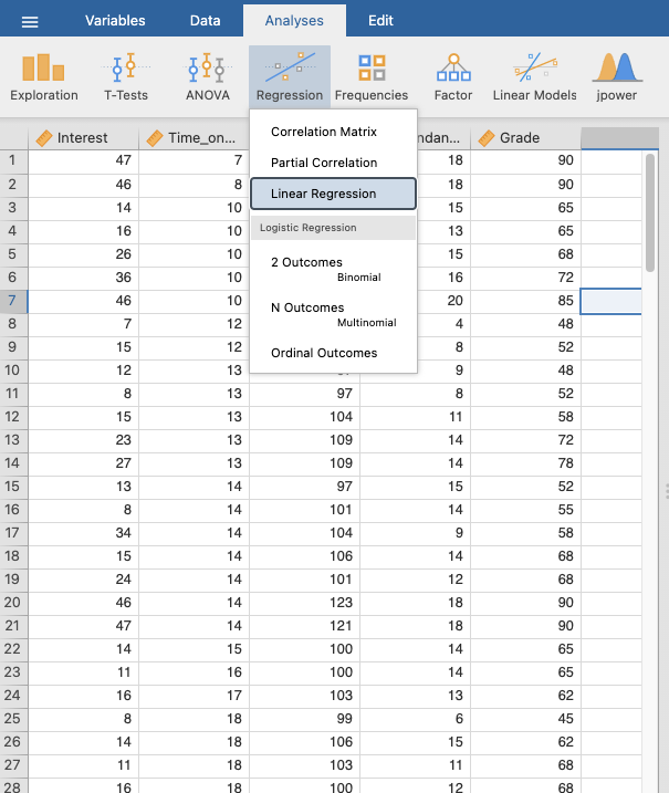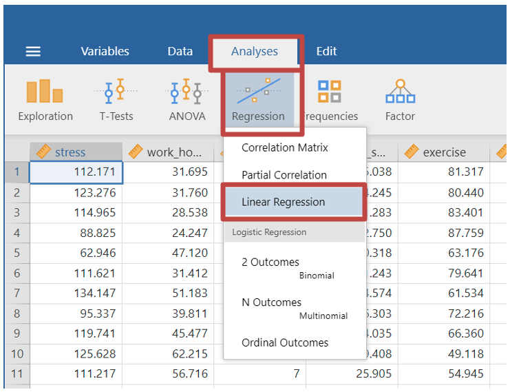- Finally you will run the Multiple Linear Regression. Select Analyses -> Regression -> Linear Regression
