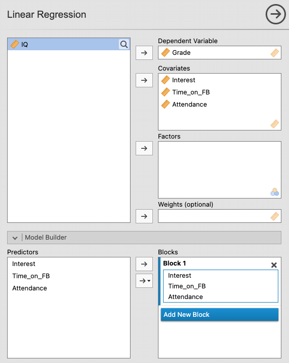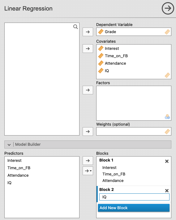 You will now create a new block or model, adding “IQ” to see predictors which students have less control over affect results. First click “Add New Block”. You should now see a “Block 2” which is currently empty.