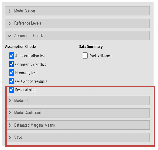 Within the “Model Fit” section, you can add some extra outputs to test whether your model fits the data i.e. how well the regression model predicts dependent variable data based on the independent variables. Here you should select the: