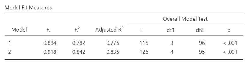 - As with multiple linear regression the first table, “Model Fit Measures” gives you information about the models fit for your data. (You can remind yourself how to interpret this by reading back within this section). This time you will have a row for each model you created (Model 1 is the first variables you selected; Model 2 is when you included IQ). The regression for Model 1 was statistically significant: F (3, 96) = 115, p < .001