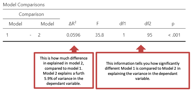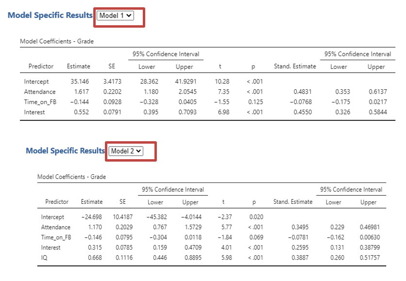 You can read how much each predictor explains the dependant variable, for each model in the “Model Specific Results”. Select the drop down next to the title to select which model you would like to see. This will change the tables thereafter based on your models.