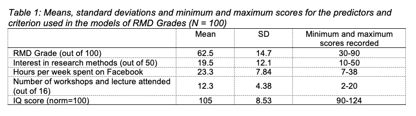 A hierarchical multiple regression analysis was conducted to compare two models for predicting RMD grade. The variables were entered in two steps in order to explore the contribution of the variables more directly under the control of students (i.e., time spent on FB, attendance at workshops and lectures, and interest shown in research methods) separately from the essentially fixed contribution of IQ score. Time spent on FB, attendance and interest were entered on Step 1, and IQ score was added on Step 2.