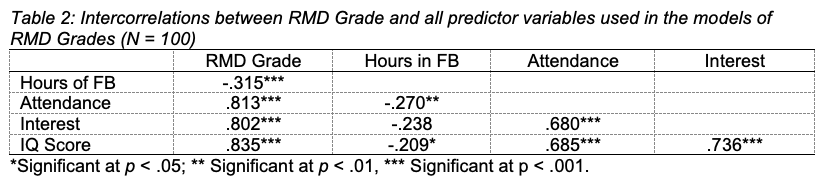The correlations between RMD grade and the predictors time spent on Facebook (FB), attendance at workshops and lectures, interest in research methods, and IQ score showed that RMD grade was positively and strongly correlated with all predictors except for time spent on FB, which was negatively and strongly correlated with RMD grade. The four predictors were all moderately to strongly correlated with each other (see Table 2).