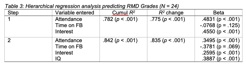 As Table 3 shows, only attendance and interest were significant predictors in the first step. In Step 2, attendance, interest and IQ were significant predictors of RMD grade. All variables together accounted for 84% of the variance in RMD grade. Students who reported higher RMD grades also scored more highly on IQ and tended to spend less time on FB.