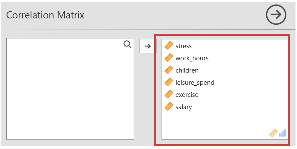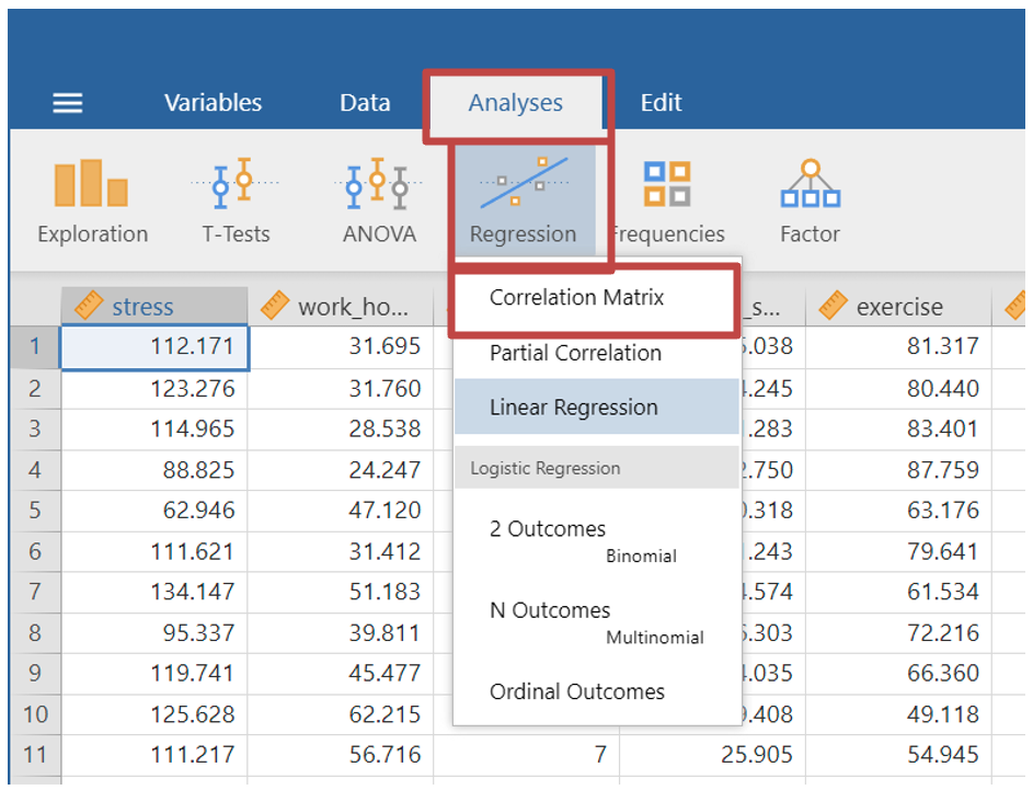 - Next you may wish to look at how well each variable correlates with one another, to test for assumptions. As shown in previous weeks, select Analyses -> Regression -> Correlation Matrix