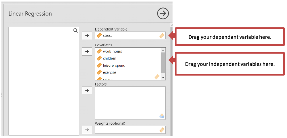 Drag all your independent variables to the covariates box (note: the covariates box is for continuous independent variables. If you have any categorical variables you would put them in the “Factors” box. However, our data is all continuous).