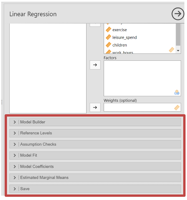 Select the “Model Builder” drop down box as you can see below. Here you can see “Block 1” which represents your first model. Jamovi should automatically place the variables you have just selected into this block. If they have not, then select the predictors and drag them over.
